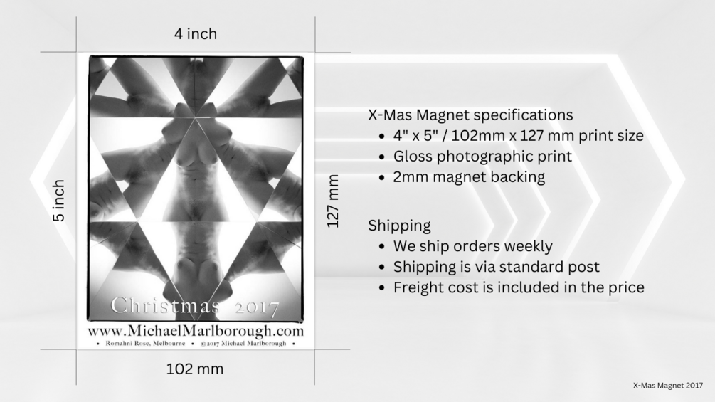 The 2017 X-Mas Magnet. Size is 4"x5", printed on photographic paper and mounted to a magnet backing.